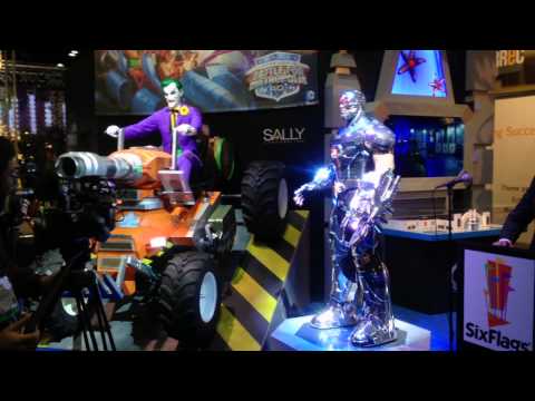 Dark ride designer Sally Corp. is developing the 4D motion base shooter attraction, Justice League: Battle for Metropolis, for Six Flags Over Texas and Six Flags St. Louis. This will be the first 3D and animatronic shooter ride on a motion base vehicle in the United States when it debuts next year. The Joker animatronic from the new attraction is now on display at the Sally booth on the IAAPA show floor.